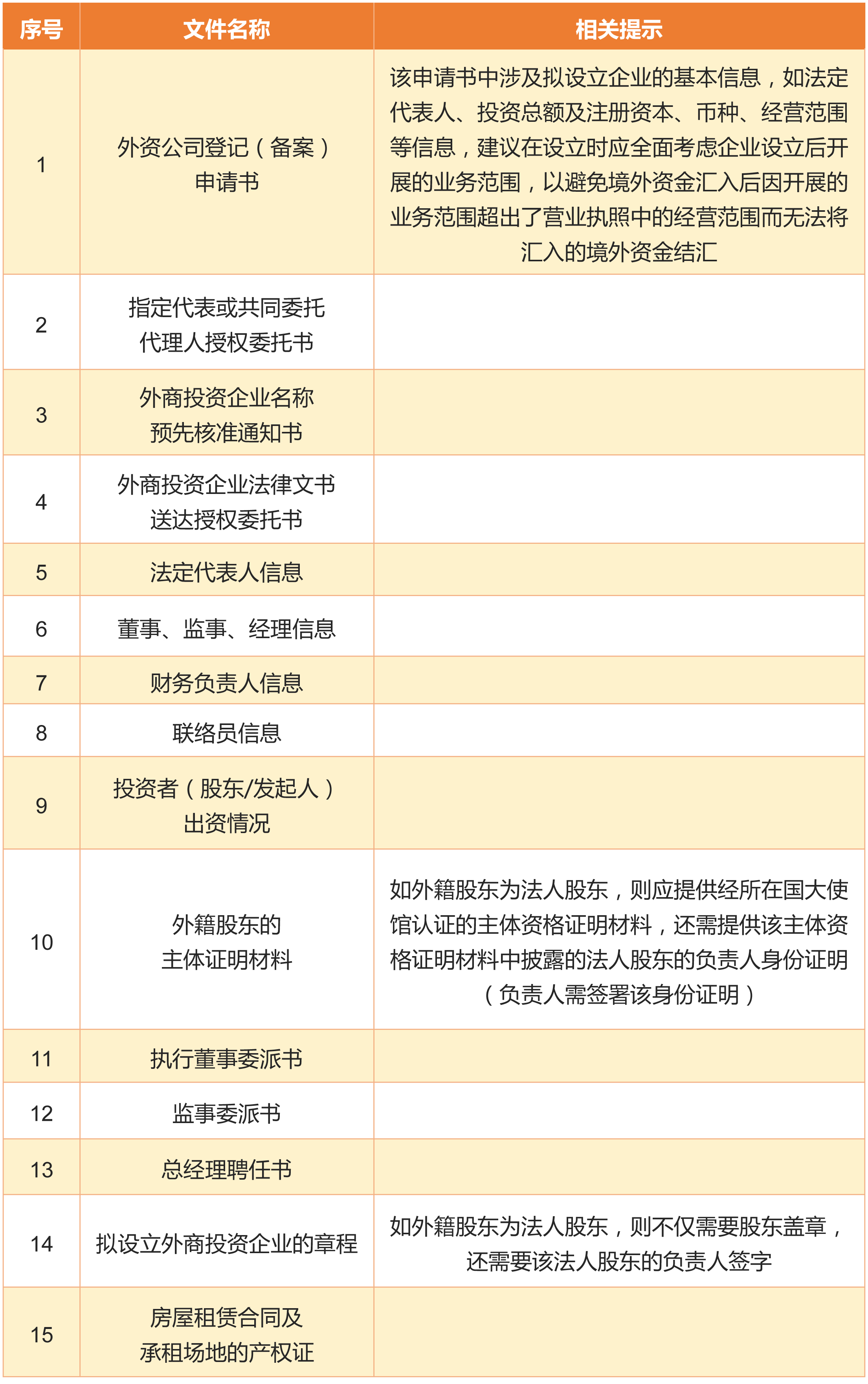 外國企業啟動在中國境內設立外商投資企業的程序,應首先通過擬設立外商投資企業所在地的工商局進行工商登記程序。因各地工商局對于外商投資企業的設立程序所涉及到的表格填寫及辦理時間長度有差異,故建議在啟動設立程序之前,應前往當地工商局全面了解所需填寫的文書類型及模板、時間長度以及需要提交的支撐文件。下面,以筆者所承辦的一個案件為例,列明設立外商投資企業程序中應提交的文件明細,僅供參考: