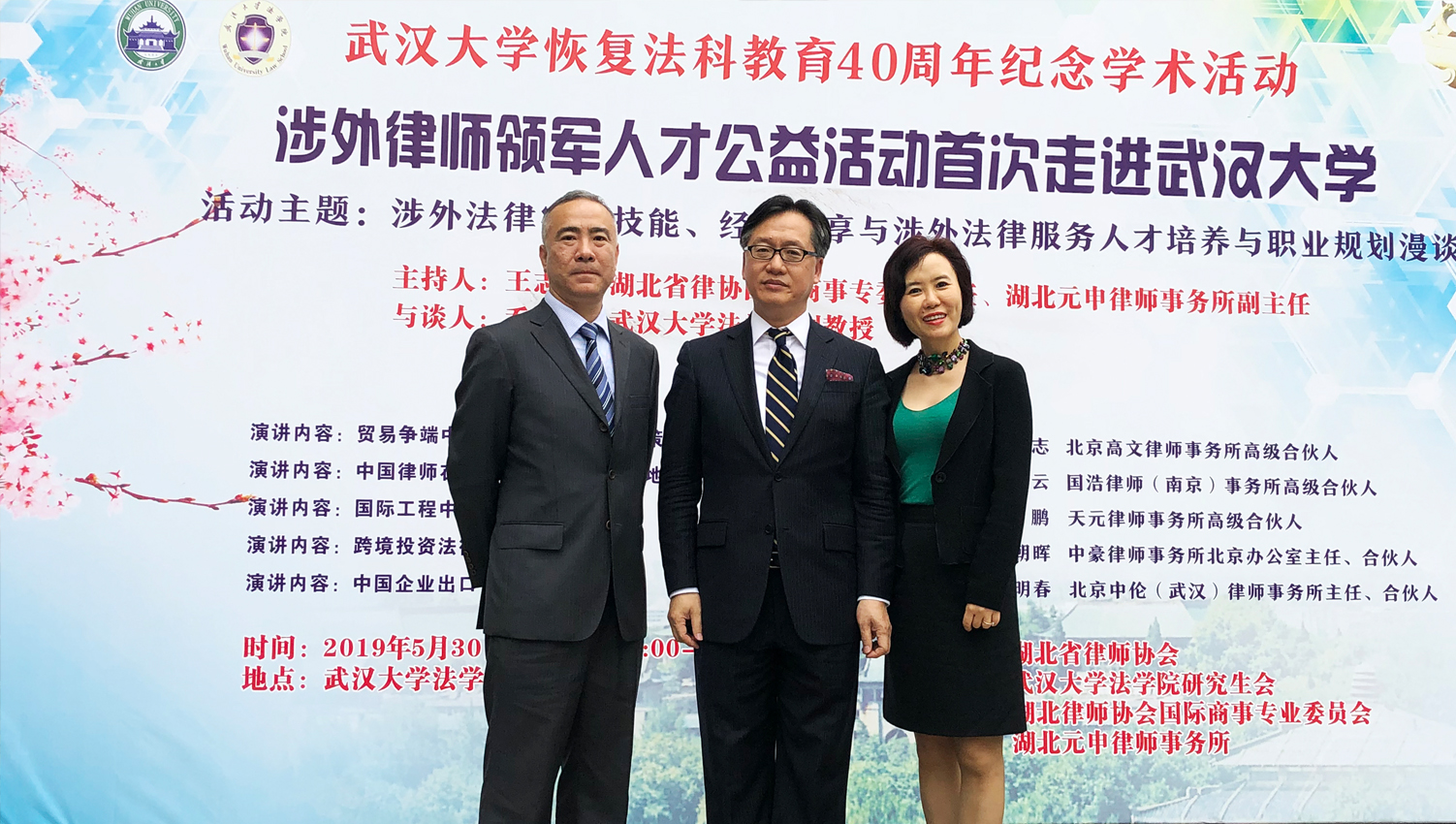 2019年5月30日,涉外律師領軍人才進校園公益活動之走進武漢在武漢大學成功舉辦。中豪北京辦公室主任、合伙人章朝暉出席本次論壇并作主題演講。2019年5月31日,同一活動在中南財經政法大學繼續舉行,章朝暉律師也在該活動中作了同一主題演講。
