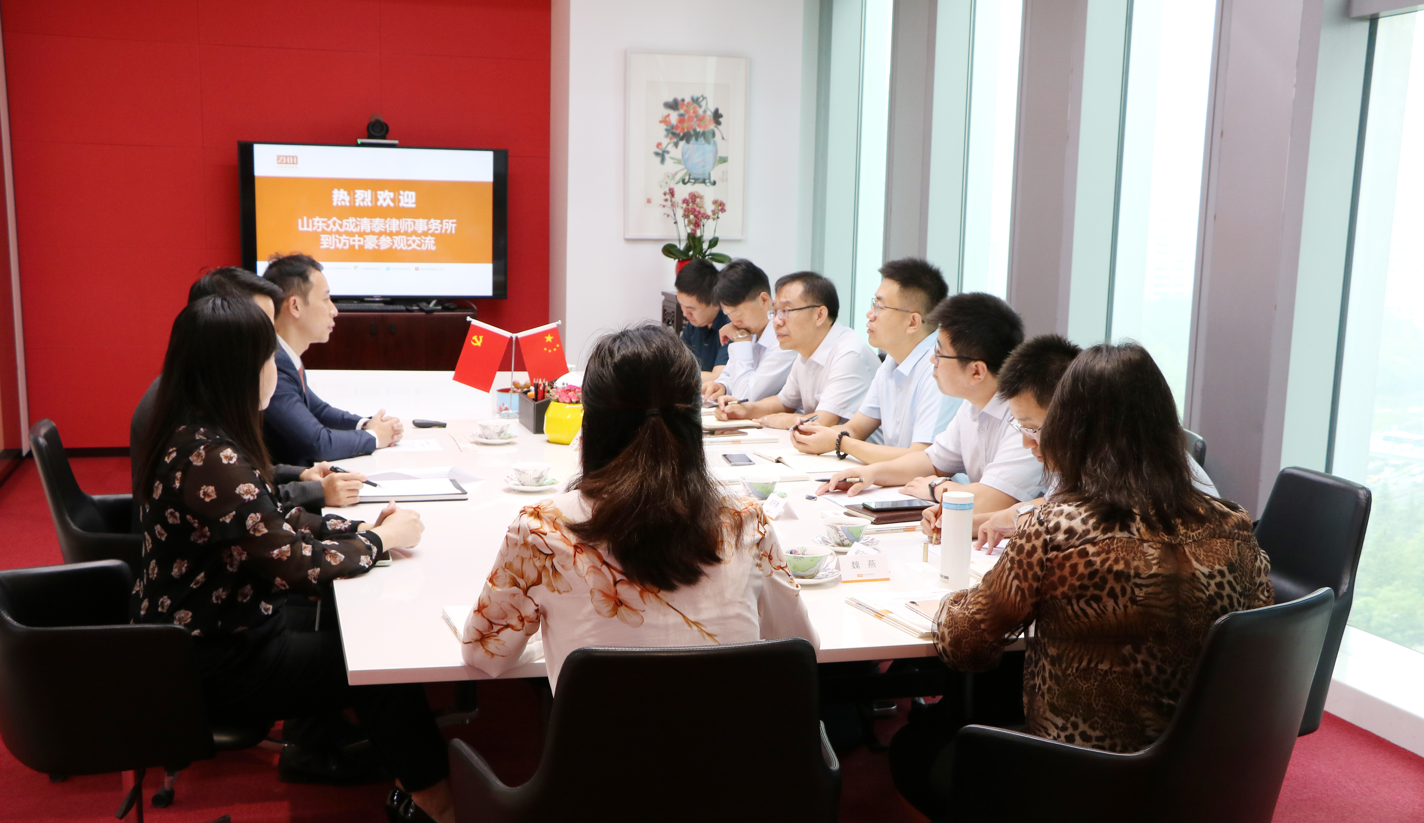 2020年9月11日,山東眾成清泰律師事務所監(jiān)事會主席姚虎明,副主任袁建、周家魁、趙開勇一行8人到訪中豪重慶辦公室參觀交流,合伙人肖東、楊青以及人力資源經(jīng)理楊彥菁進行了熱情接待和友好交流。