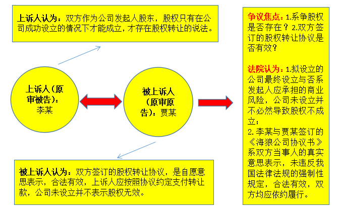 李某與賈某簽訂的《海狼公司協議書》系雙方當事人的真實意思表示,未違反我國法律法規的強制性規定,合法有效,雙方均應依約履行。李某上訴稱其未支付剩余款項的原因系雙方間的轉讓沒有對價,海狼公司沒有成立,合同目的無法實現。法院認為,雙方在《海狼公司股東協議》中確認了賈某和案外人對海狼公司的前期投資,在《海狼公司協議書》中約定了轉讓標的為股權及由此產生的收益,李某與賈某作為發起人對于擬設立的海狼公司均擁有權益,李某系自愿收購該權益,且海狼公司原定營業地址現為李某用于運營北京希沃福西餐有限公司,故《海狼公司協議書》中約定的轉讓并不能等同于沒有對價的轉讓。同時,《海狼公司協議書》并未約定賈某負責海狼公司設立或者海狼公司未能設立而承擔的責任,擬設立的公司最終設立與否系發起人應承擔的商業風險。綜上,李某的上訴意見缺乏事實及法律依據,不予支持。