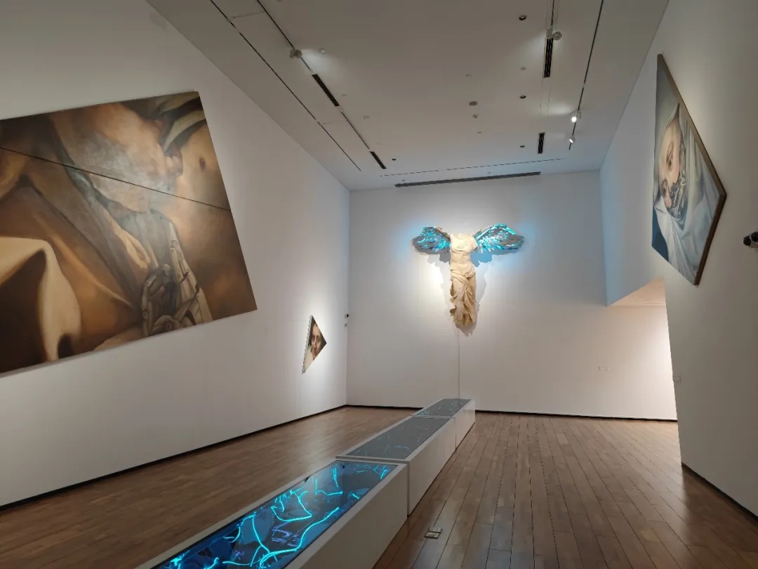 圖中間雕塑為龐茂琨作品:《脈息》。該作品將原來的勝利女神的雙翼替換成了鋼鐵,在展廳水泥墻背景和正頂光的肅穆氛圍下,象征意味十足。將科技與古典形象結合,仿佛也在暗示藝術家擔心科技未來將走向的某種極端趨勢。