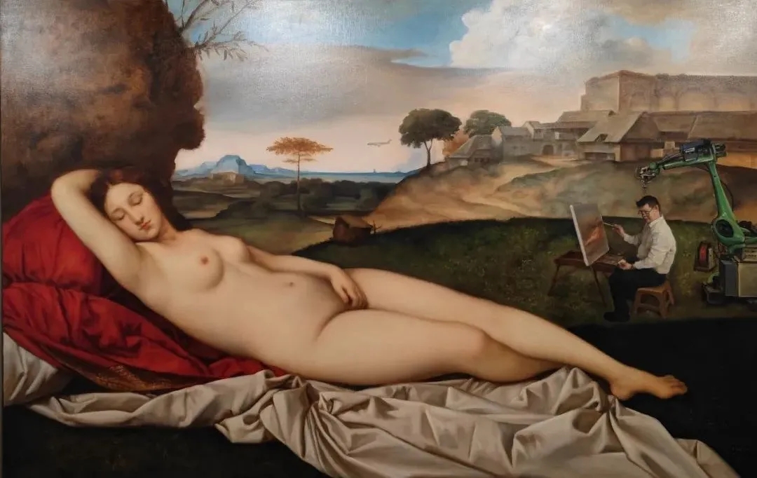 圖為龐茂琨作品 :《被打印的藝術家與被描繪的維納斯》,布面油畫,2017年。該作品極具趣味性地將一位3D打印的藝術家與油畫《入睡的維納斯》相結合,讓觀眾不僅能從其中獲得快樂,更可以通過這些“錯位”的效果而產生一些思考。