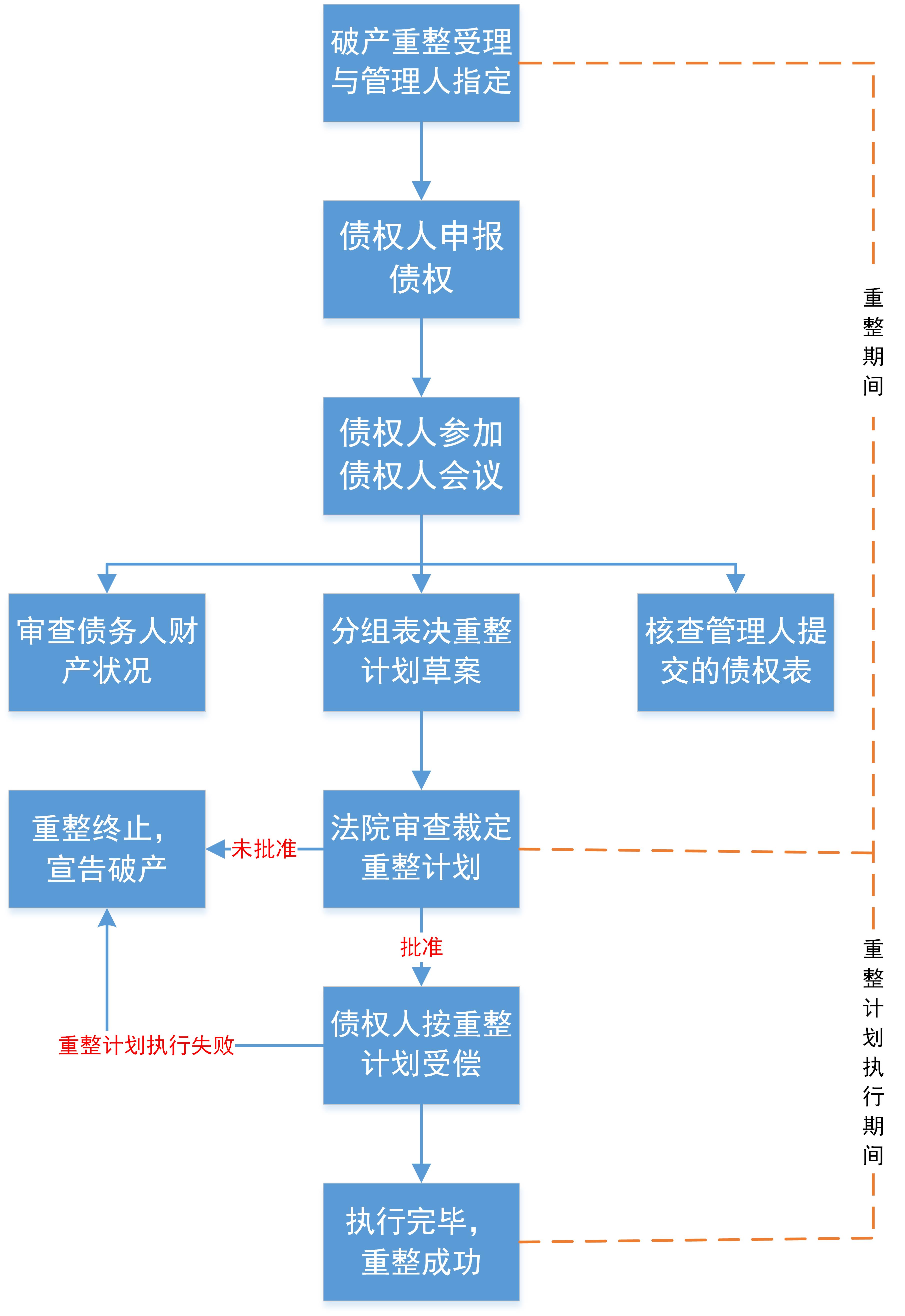重整,是指對可能或者已經發生破產原因但又具有挽救希望與價值的企業,通過對各方利害關系人的利益協調、強制性進行營業重組與債務重組,以使企業避免破產、獲得新生的法律程序。債權人參與的基本流程如下: