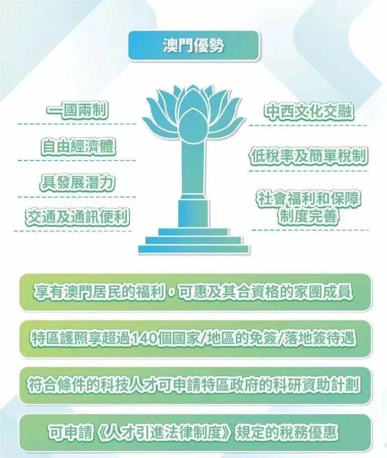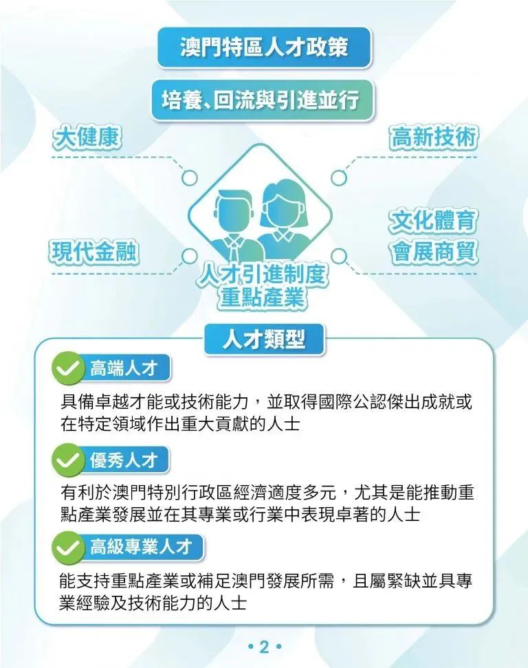 《澳門人才引進法律制度》于7月1日生效,該制度圍繞四大重點產業(大健康、現代金融、高新技術、文化體育)所需,引進高端人才、優秀人才和高級專業人才三類人才,部分人才不論是否在澳門通常居住,均可申請居留許可續期。