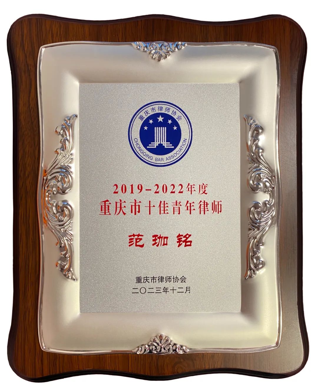 2023年12月18-19日,重慶市律師協會第八次律師代表大會在金科大酒店順利召開。會議期間,大會舉行了“2019-2022年度重慶市十佳青年律師”頒獎儀式,合伙人范珈銘榮獲該獎。