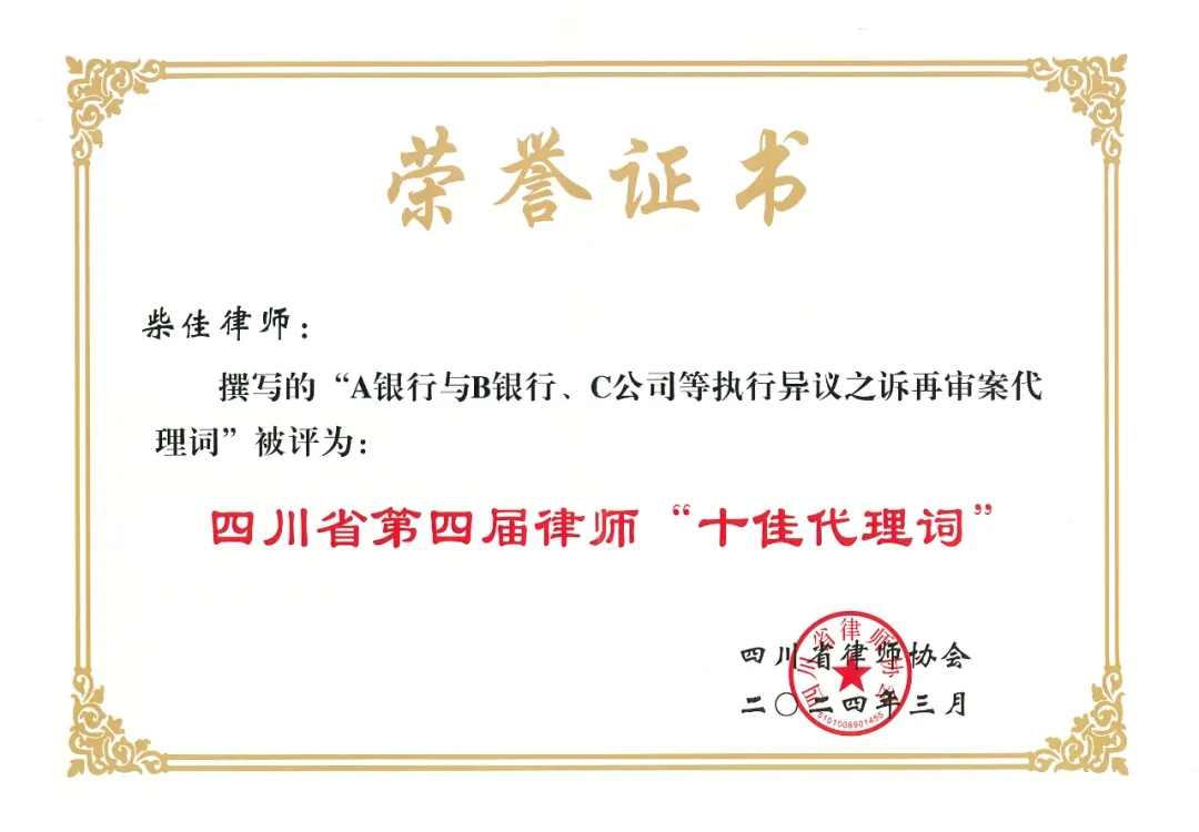 為切實增強對律師業務的專業性和規范性指導,充分發揮優秀代理詞、辯護詞的示范引領作用,全面展示律師良好職業形象,2024年3月28日,四川省律師協會對四川省第四屆律師“十佳代理詞”“十佳辯護詞”獲獎律師進行了表彰。合伙人柴佳的《A銀行與B銀行、C公司等執行異議之訴再審案代理詞》榮獲四川省第四屆律師“十佳代理詞”。