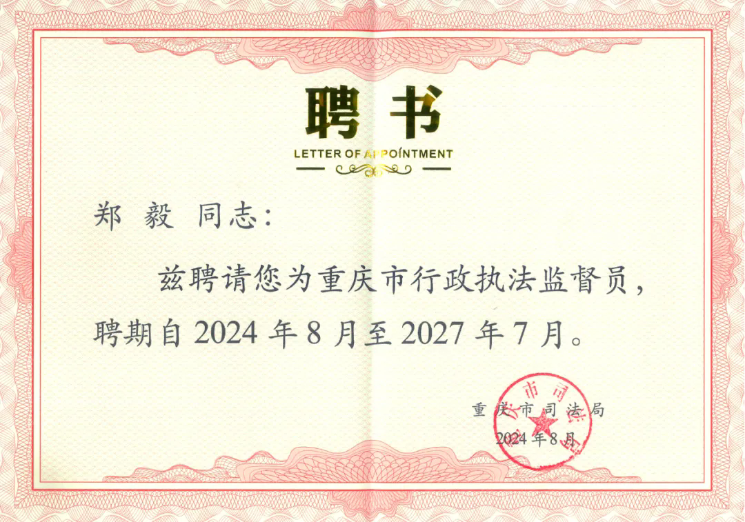 2024年11月14日,市司法局、市工商聯(lián)召開(kāi)“法治護(hù)企”座談會(huì),舉行了“法治護(hù)企”企業(yè)聯(lián)系點(diǎn)和行政執(zhí)法監(jiān)督員授牌聘任儀式。授牌儀式上,市司法局與市工商聯(lián)向首批10家企業(yè)聯(lián)系點(diǎn)授牌,并為20名行政執(zhí)法監(jiān)督員頒發(fā)聘書(shū)。管委會(huì)副主席鄭毅受聘擔(dān)任重慶市行政執(zhí)法監(jiān)督員。