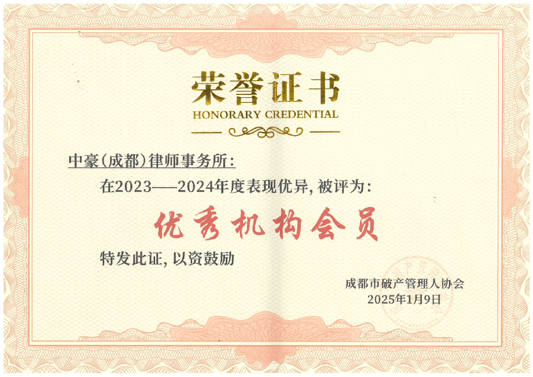 本次評選于2024年6月啟動,經協會會員發展與權益保障委員會初審、專家評審組復審、協會會長辦公會審議確定最終表彰名單。中豪成都辦公室獲得多項殊榮,代表了協會及行業同仁對我所辦理破產案件質量與能力的高度肯定。中豪將珍惜榮譽,充分發揮典型示范作用,精研破產業務,砥礪深耕,以期為推動破產管理人事業發展、助力經濟高質量發展和法治營商環境建設貢獻更重要的力量。
