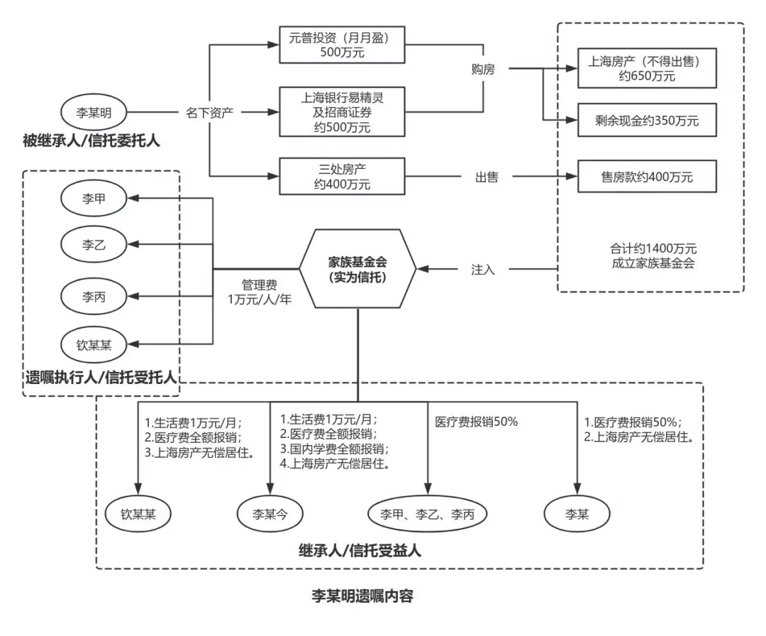 李某明擁有元普投資(月月盈)500萬元由招商證券托管、上海銀行易精靈及招商證券約500萬元資產,還有三處房產。財產處理上,要求在上海購約650萬元房產傳下一代且不得售,現有三套房產可售,所得并入“李某明家族基金會”,不售則收租,剩余款項及售房款約1400萬元成立“基金會”管理。財產使用上,規定欽某某和李某今每月領1萬元生活費、醫療費全報,李某今國內學費全報;欽某某、李甲、李乙、李丙每年各領1萬元管理費,妻兒及三兄妹醫療費自費部分報一半。